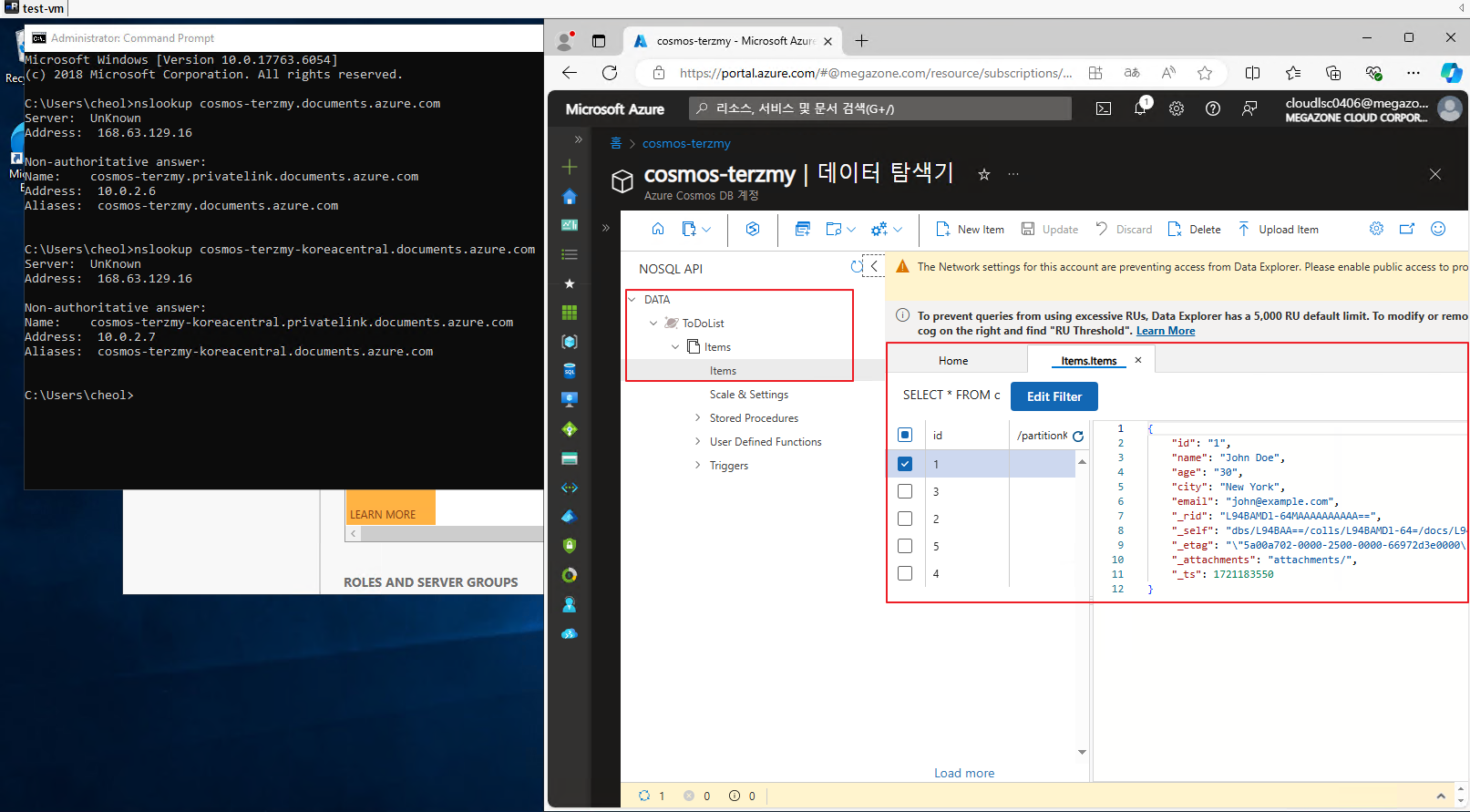 Portal에서도 정상적으로 접근이 되고 (데이터는 아직 없다) nslookup 테스트를 통해 정상적으로 Private endpoint 통신이 되는 것을 볼 수 있다.