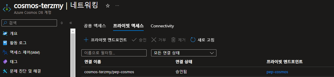 생성된 Managed Private endpoint를 확인하고 CosmosDB로 가서 승인 절차를 진행한다.