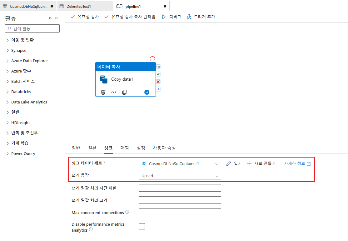 Blob Storage에 업로드되어있는 csv 파일을 Azure Cosmos DB로 데이터를 복사하는 파이프라인 구축