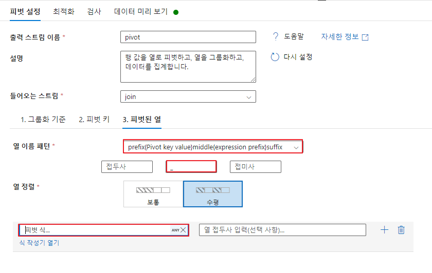 - 피벗 설정 탭으로 가서 그룹화 기준의 열 추가와 출력 스트림 이름을 설정합니다.