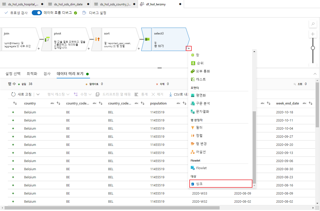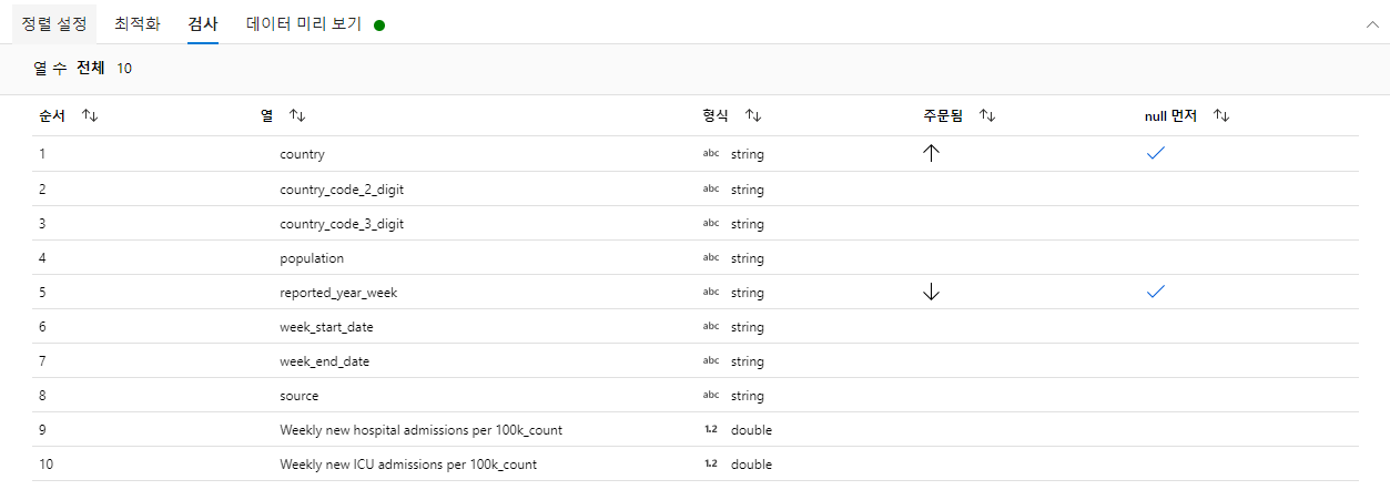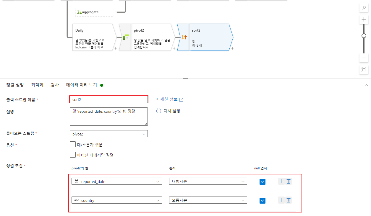 - 정렬 데이터 흐름에 대해서 검사 및 데이터 미리보기를 진행합니다.