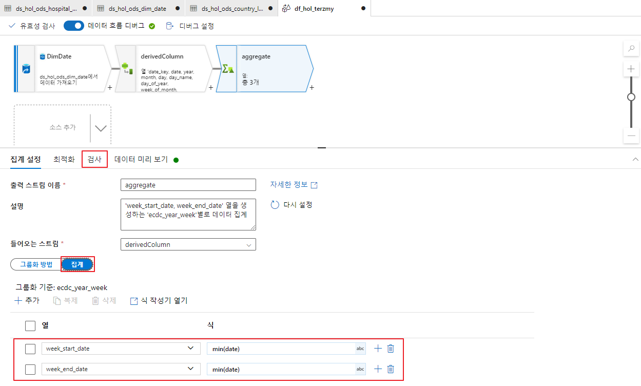 - DataFlow Dim Date의 파생열을 검사 및 데이터 미리보기를 진행합니다.