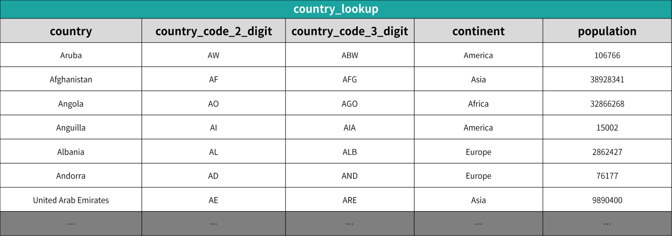 - "country" column기준, 국가 코드와 인구 정보를 Lookup