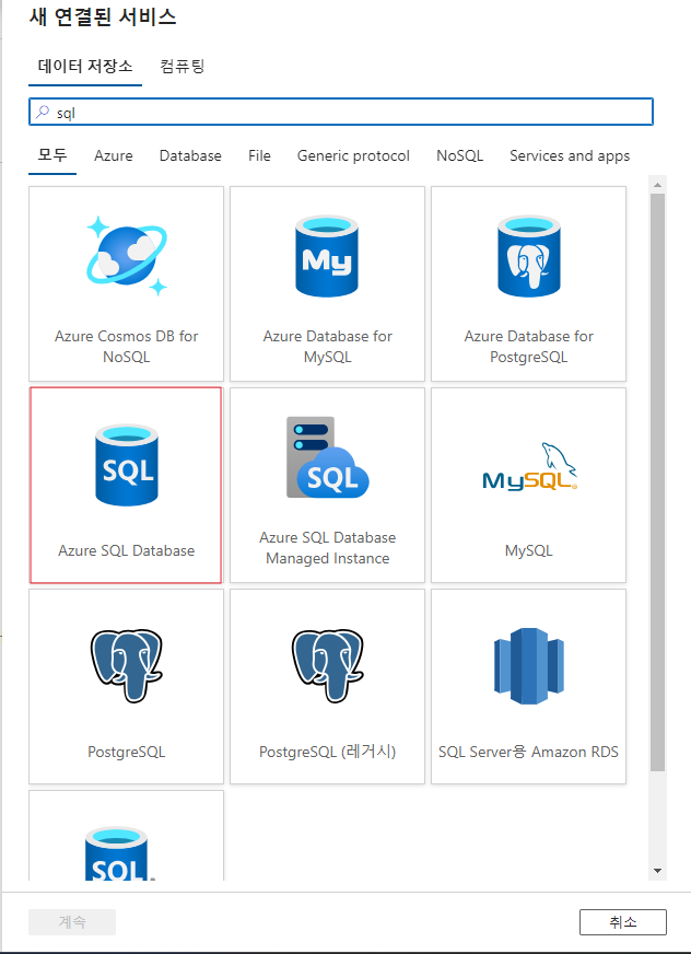 - 새 연결된 서비스로 Azure SQL Server를 선택합니다.