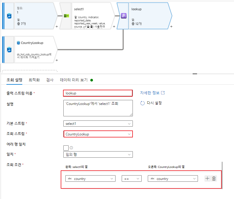 조회(Lookup) 액티비티는 HospitalAdmissions 소스의 country 컬럼 데이터를 기준으로 CountryLookup 소스의 country 컬럼의 값과 일치하면, countryLookup 소스의 데이터를 가져오도록 하는 역할을 수행합니다.