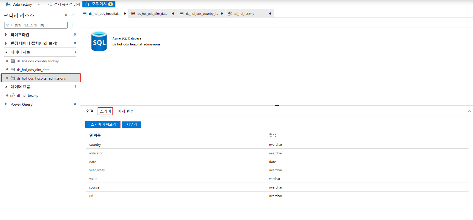 데이터 세트 >> 해당 데이터세트 클릭 >> 스키마 >> 스키마 가져오기
