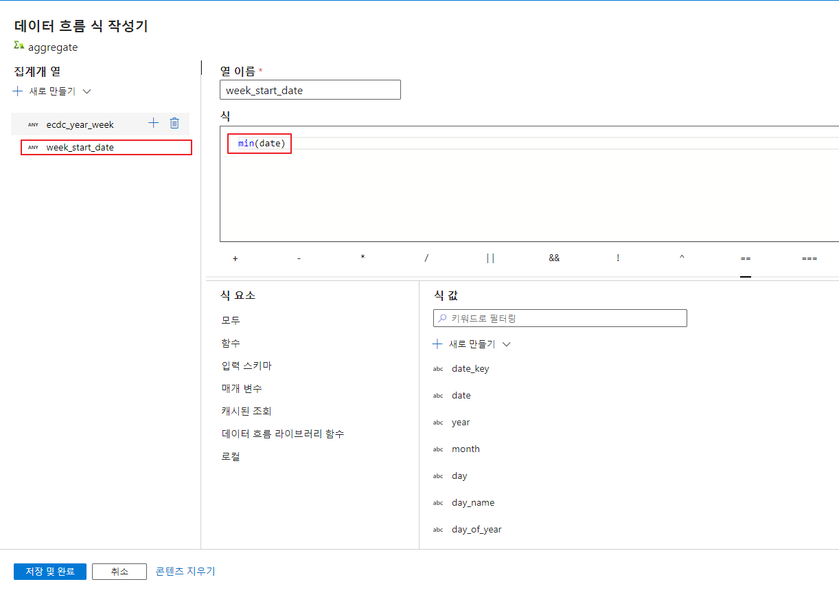 - 작성된 식으로 인해서 출력된 컬럼을 볼 수 있습니다. 확인 후 저장 및 완료를 클릭합니다.