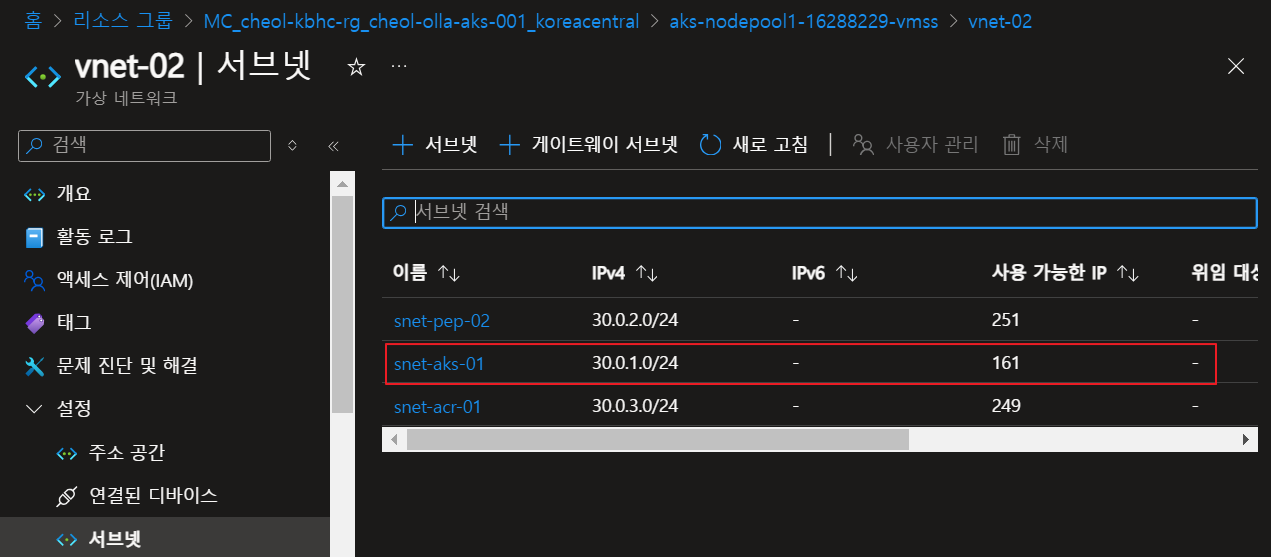 Azure CNI Node Subnet은 AKS Cluster가 배포된 가상 네트워크의 서브넷 CIDR에서 IP를 배정한다.