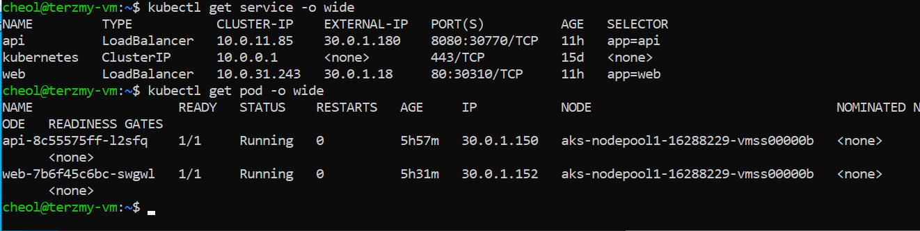 현재 AKS의 CNI는 Azure CNI 노드 서브넷이므로 가상머신에서 Pod로 접근이 가능하다.