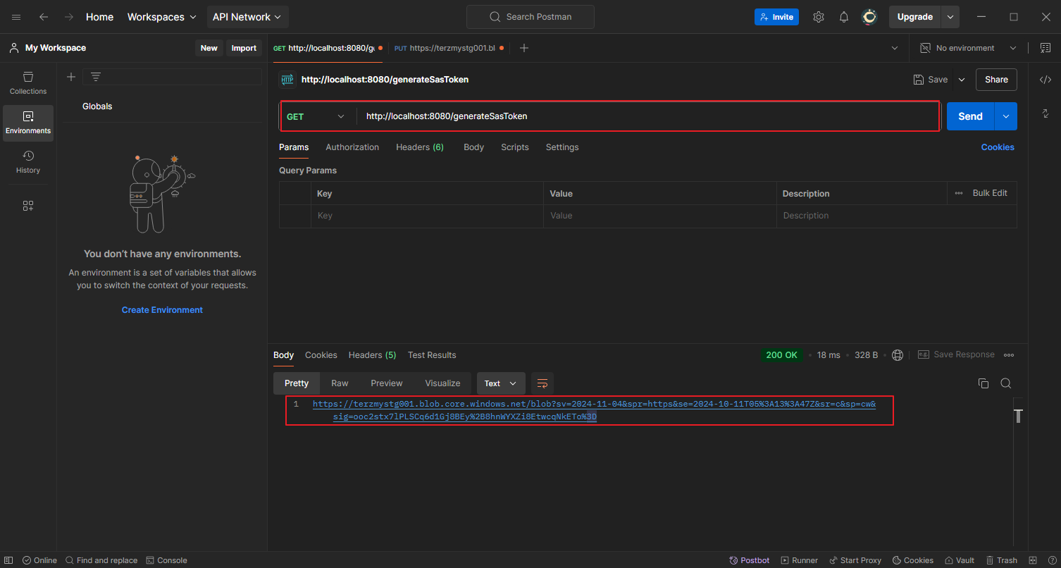 - SAS URL 반환을 위해 http://localhost:8080/generateSasToken으로 GET 요청