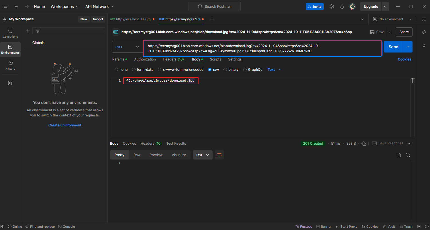 - 해당 URL 기반으로 Azure Blob Storage에 이미지 업로드 PUT 테스트