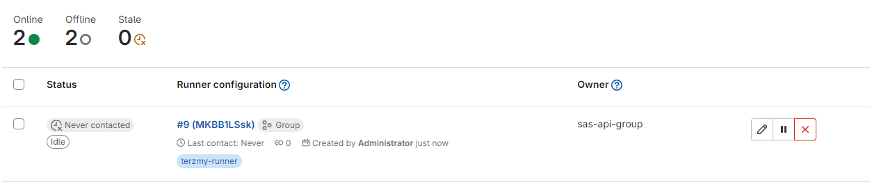 - runner만 생성한 것이고 아직 runner pod를 생성하지 않았기 때문에 연결은 되지 않은 상태이다.