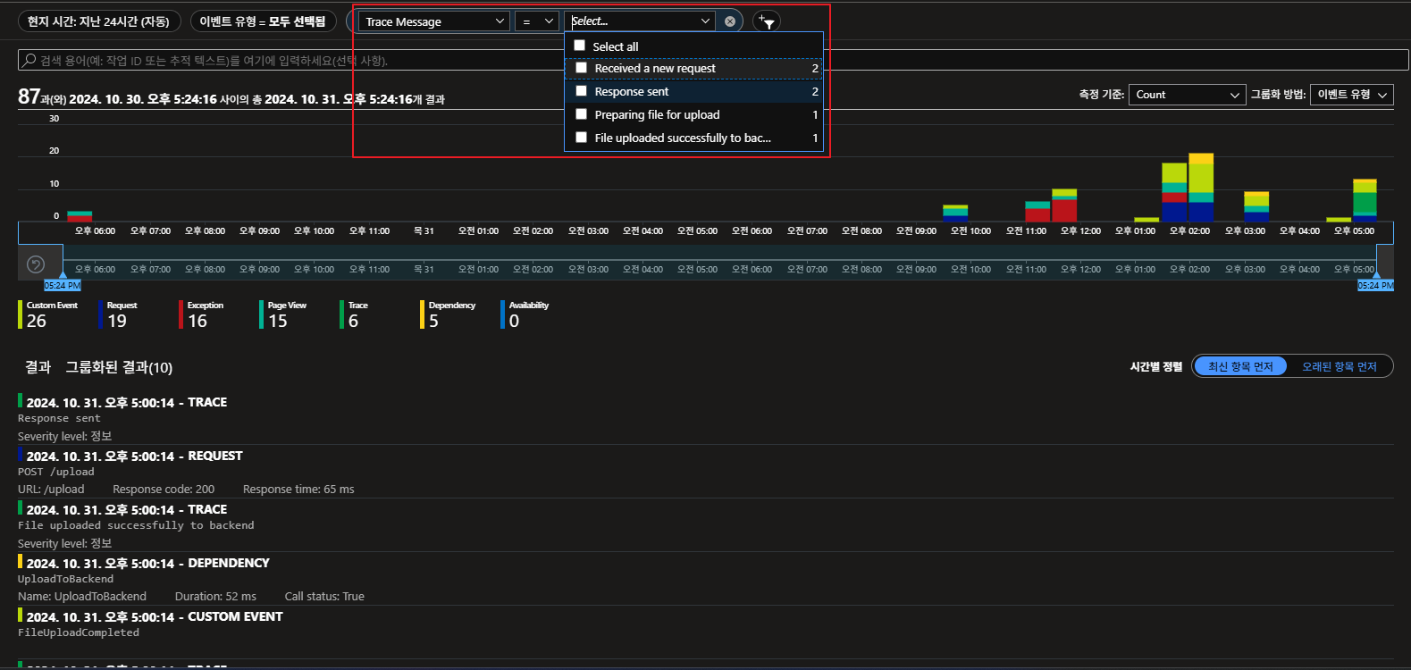 - Frontend에서 Backend API를 통해 BlobStorage로 이미지를 업로드하였고 정상적으로 Application Insights에서 트랜잭션 추적 모니터링이 가능한 것을 볼 수 있었습니다.