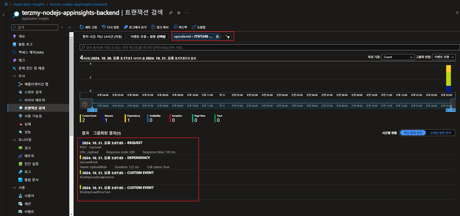 - Azure Application Insights >> 트랜잭션 검색 >> 필터링 : operationID