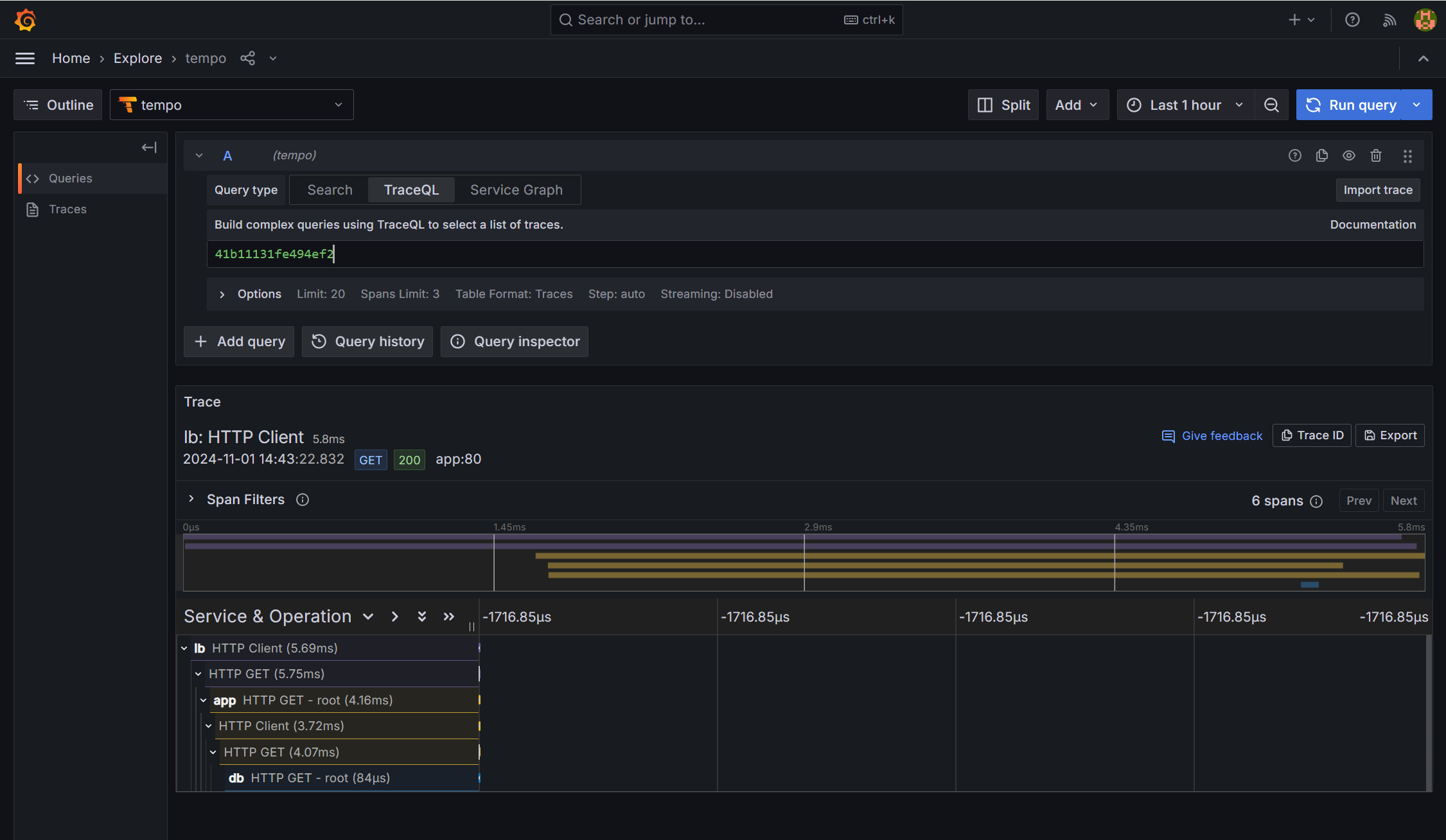 - Explore로 이동해서 Trace를 쿼리합니다.