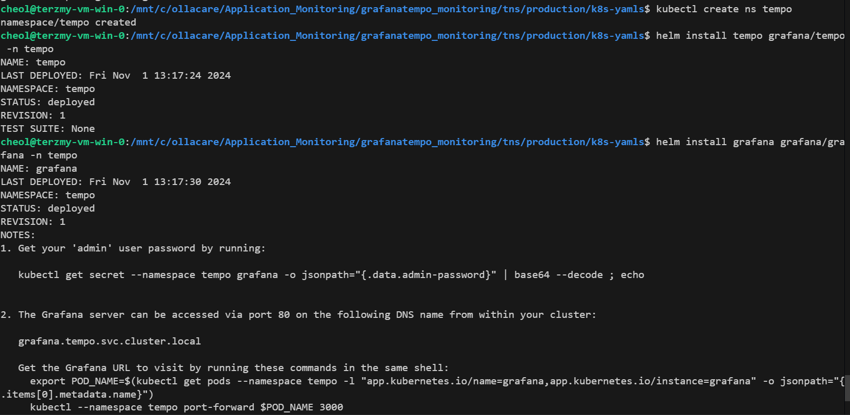 - 다음 명령어를 통해서 Tempo 네임스페이스를 생성하고 Helm Chart로 Tempo와 Grafana를 배포합니다.