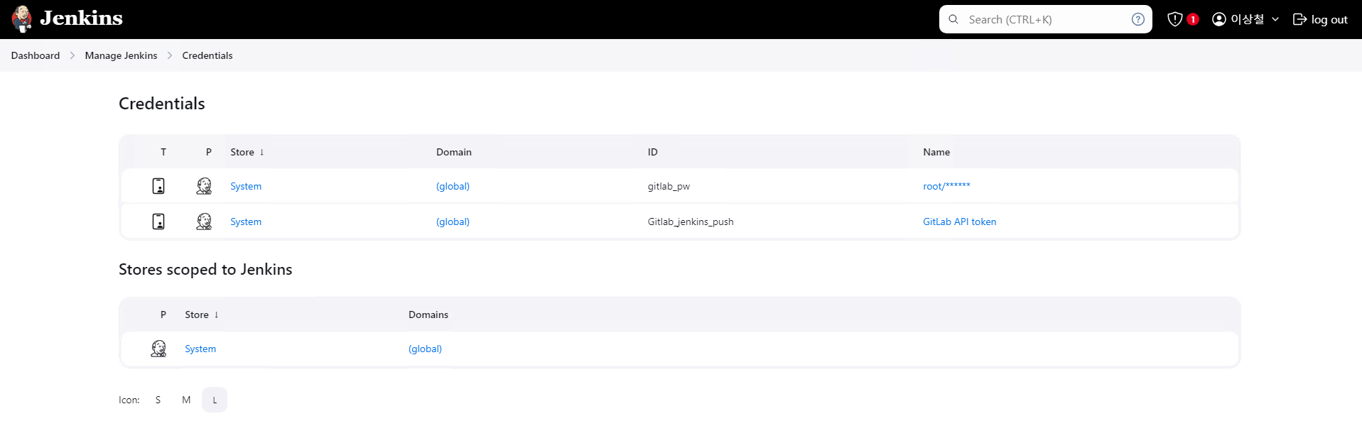 Manage Jenkins >> Credentials에서 Gitlab과 연결을 위한 인증 정보들을 관리합니다.