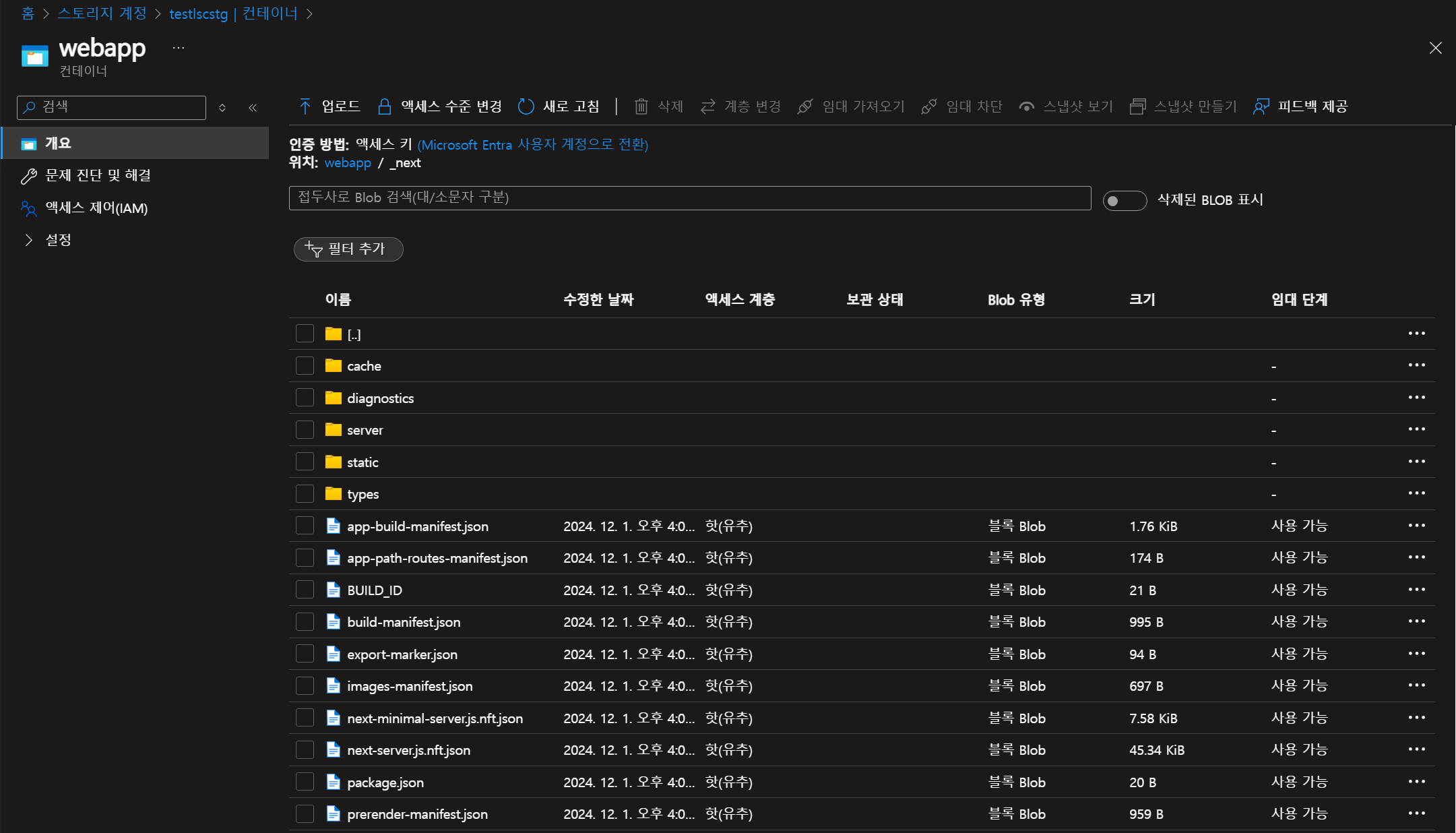 Blob 스토리지의 webapp이라는 컨테이너에 _next/static 경로에 정적컨텐츠를 업로드합니다.