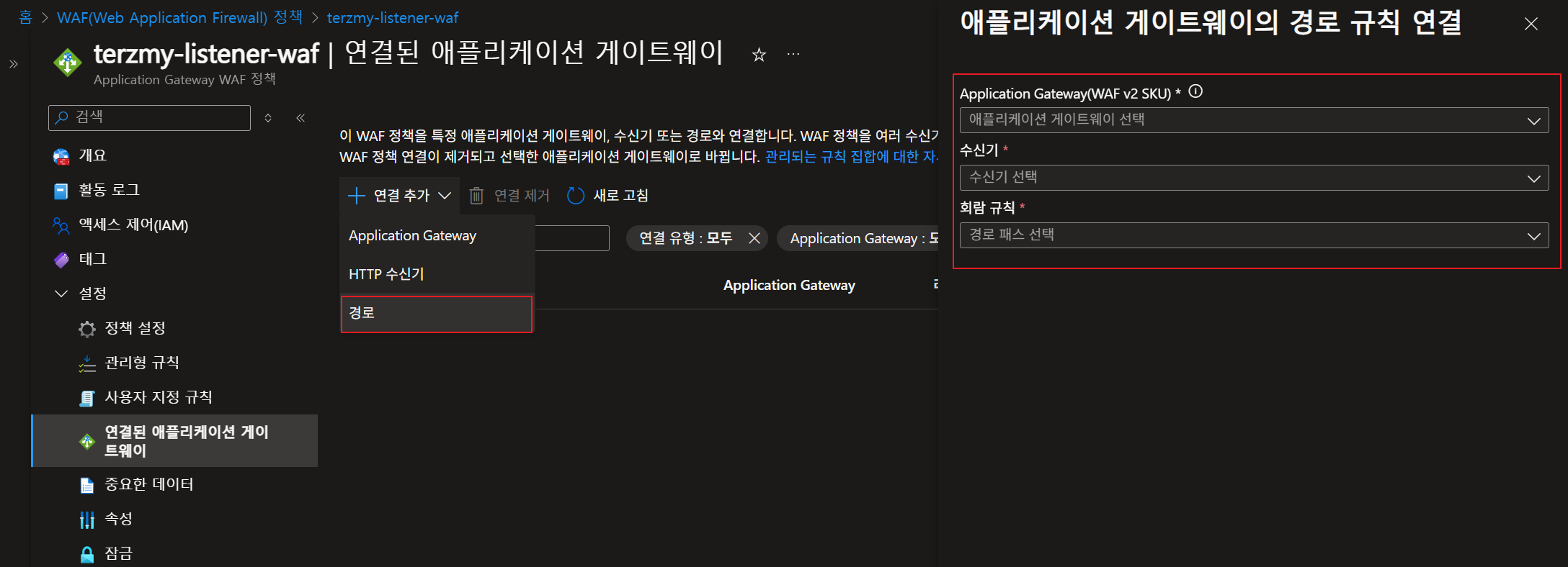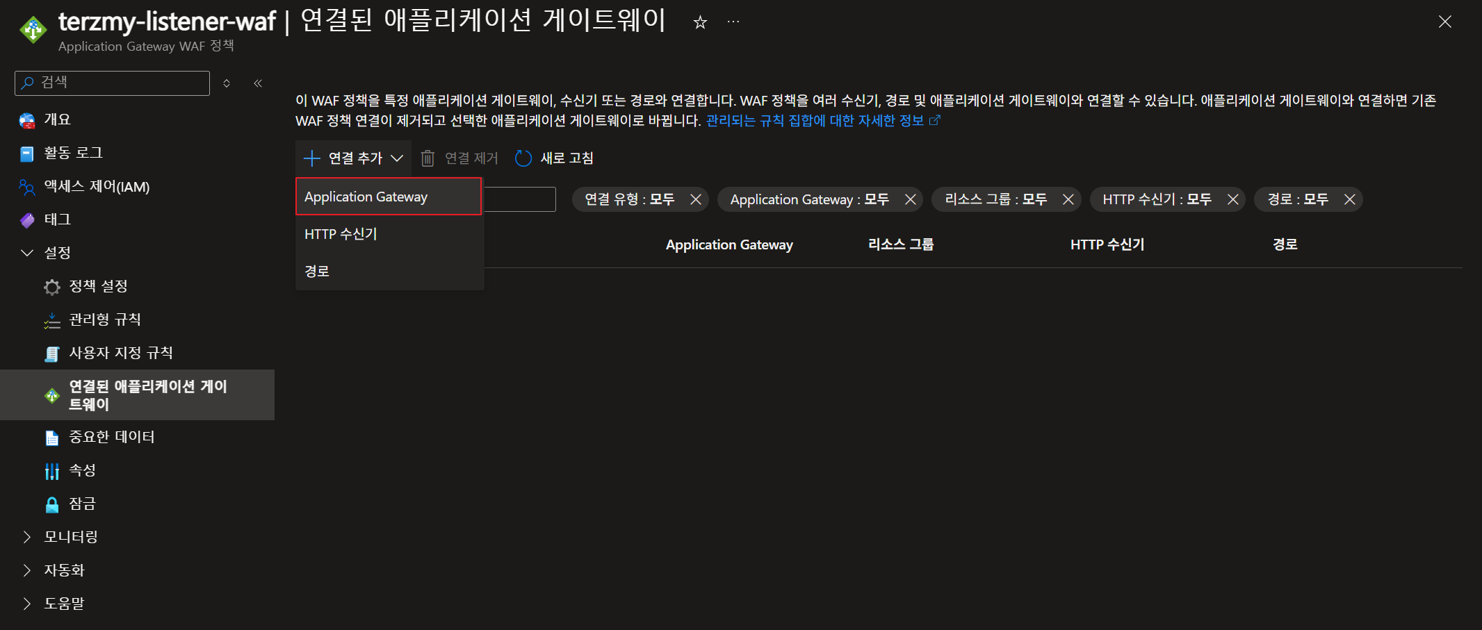 - WAF 정책을 기본적으로 생성 후 '연결된 애플리케이션 게이트웨이'에서 HTTP 수신기로 연결을 진행합니다.