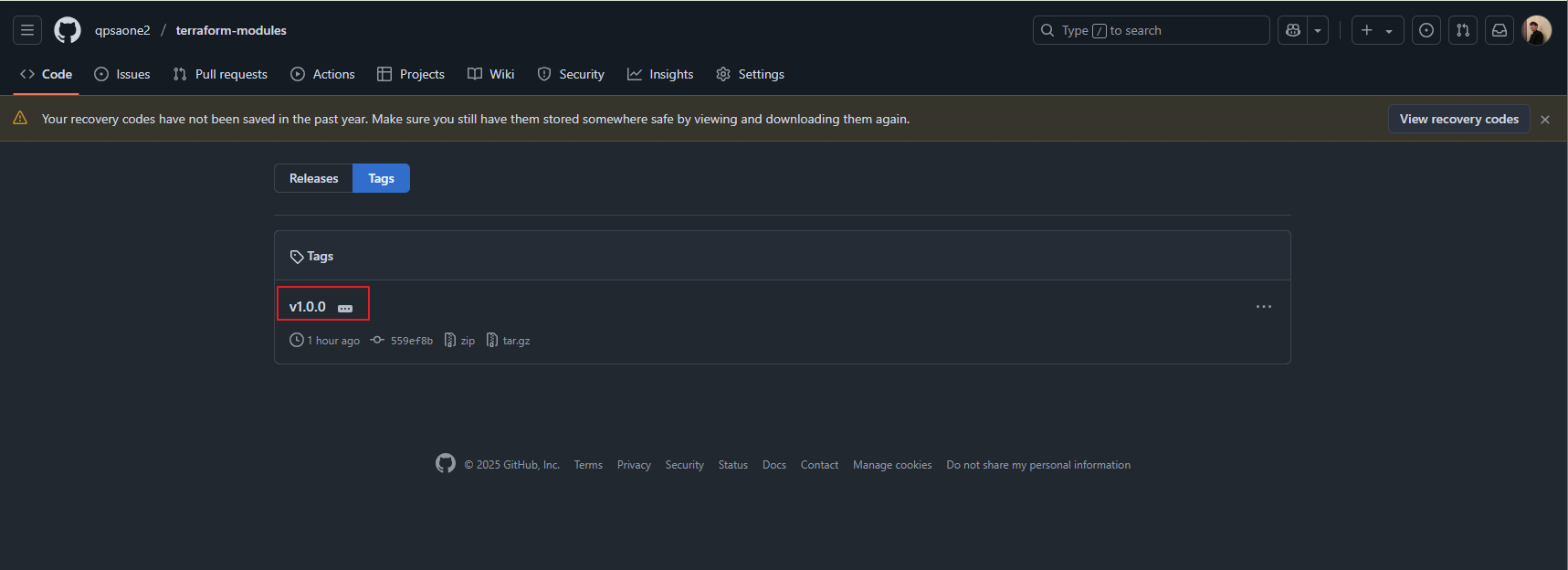 태그 생성 후 github으로 push 했기때문에 github에서 새로운 태그가 추가되어 모듈 코드가 업로드 된 것을 확인할 수 있습니다.