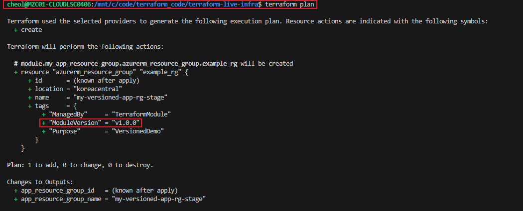 이렇게 진행하게되면 어떤 버전의 모듈을 사용하여 리소스 그룹을 생성하였는지 명시적으로 알 수 있습니다.
